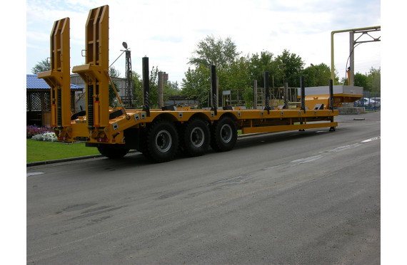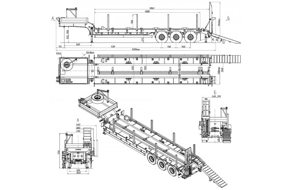 45000 кг, шины 445/65R22,5 или 395/85R20 / 6+1, платформа 10300 (11080 до трапов) x 2500 с уширителями до 3000 мм, механические трапы, ССУ 1510 мм, рессорная подвеска, съемные стойки 1500 мм