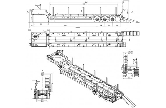 44700 кг, шины 395/85R20 или 445/65R22,5 / 6+1, платформа 12000 (12862 до трапов) x 2530 с уширителями до 3030 мм, ССУ 1420 мм, рессорная или пневматическая подвеска, раздвижные коники, механические трапы с пружиной