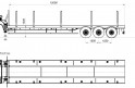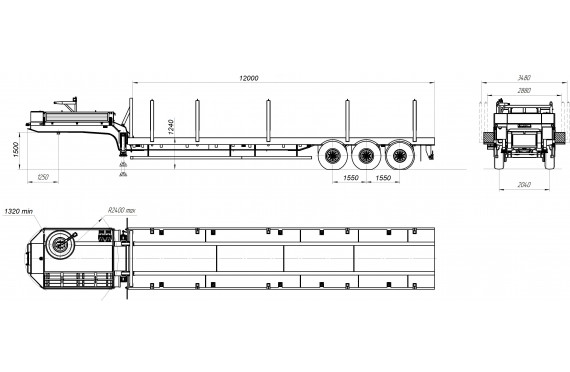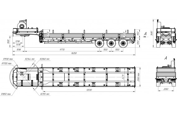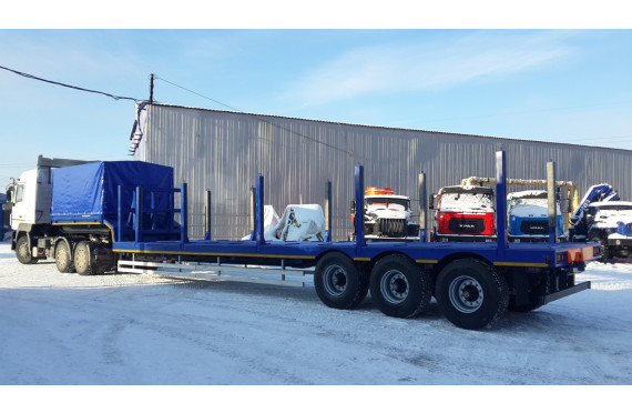 45200 кг, шины 395/85R20 или 445/65R22,5 / 6+1, платформа 12000 (12862 до трапов) x 2530 с уширителями до 3030 мм, ССУ 1550 мм, рессорная или пневматическая подвеска, съемные стойки, механические трапы с пружиной