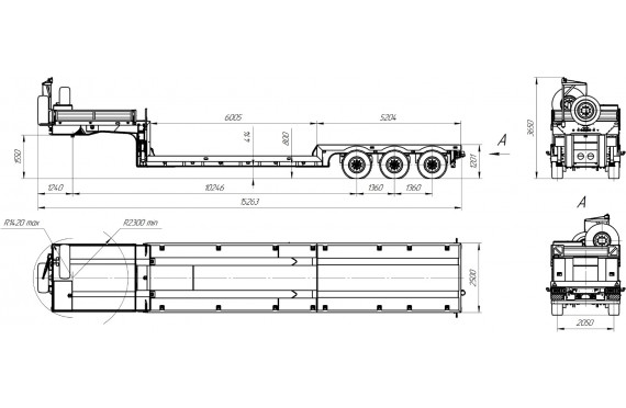 45000 кг, шины 395/85R20 или 445/65R22,5 / 6+1, платформа 10000 (10862 до трапов) x 2530 с уширителями до 3030 мм, ССУ 1532-1550 мм, рессорная или пневматическая подвеска, раздвижные коники