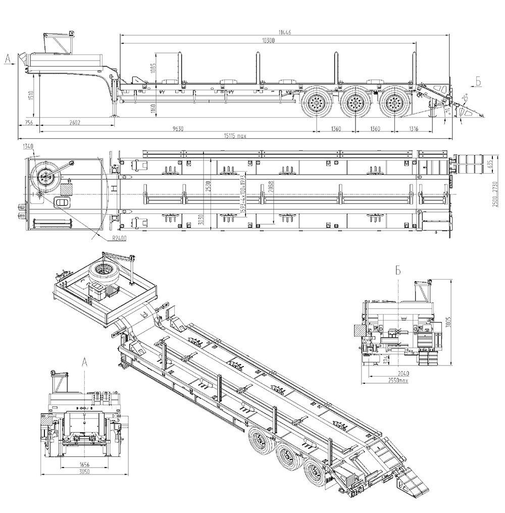 39000 кг, шины 385/65R22,5 или 445/65R22,5 / 6+1, платформа 11080 до трапов) x 2500 с уширителями до 3000 мм, ССУ 1510 мм, пневматическая или рессорная подвеска, съемные стойки 1500 мм, механические трапы